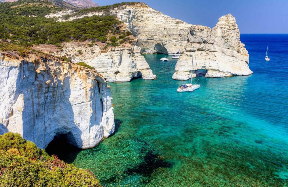 Arrive in Milos at 09:00 and immerse yourself in the captivating landscape of this Greek island. Its volcanic origins are evident in the bewitching terrain, where dramatic rock formations emerge from crystalline waters, shaping the stunning coastline. Optional tours available.
