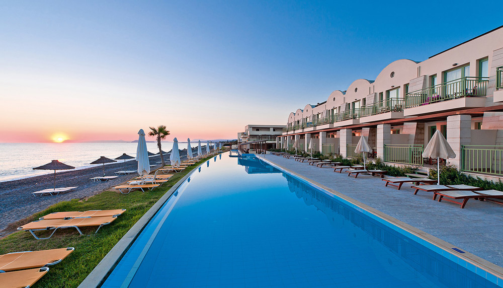 Benefits of optional Premium All inclusive on top of the description above are a change of the lunch buffet to A-La-Carte lunch (beach-front sealine kiosk), with no limitations on frequency, upon reservation one day in advance, bottled wine (white, red, rose), bottled water, bottled soft drinks and bottled beer are included and will not require extra payment. Change of the dinner buffet to A-La-Carte dinner at the roof-top Azzuro restaurant, with no limitations on frequency, upon reservation one day in advance, bottled water, bottled soft drinks and bottled beer are included and will not require extra payment. Dine around to all 4 Giannoulis hotels and Resorts (Reservations one day in advance required, no transfers included). Selection of 9 bottled local wines (3 red, 3 white, 3 rose) during lunch and dinner. Branded imported international alchoholic drinks, all cocktails included in the bars menus with branded international imported spirits and local sparkling wines (Pool bar: 10:00-19:00), Lobby Bar: (19:00-21:00). Premium brands, VSOP cognac, malt whiskies and international champagnes are not included. Daily sunset champagne cocktails (1 hour), Two themed nights per week (olive oil night and barefoot beach BBQ) at no extra charge. The A-La-Carte traditional Greek breakfast (reservation required one day in advance). Bookable sunbeds at the beach, Mini Bar included (refilled on a daily basis with 2 bottles of water, soft drinks, Wine & 2 cans of beer). 4 capsules of espresso in room per day, 45 minutes of massage and light wellness treatments per person per week, chosen by the guests from the menu of offered treatments, free use of en-suite safety box.