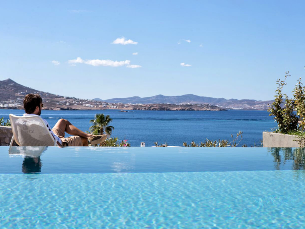 Superior Suite Pool and Side Sea View or Sea View (28m2) Sleeps up to 2 persons. The luxurious Suite consists of a modern, decorated bedroom, veranda and private pool  with breath-taking view to the surrounding hills. Guests can enjoy the comfort of the modern architecture with inspiring elements that embrace the Cycladic ambience. the exquisite interior design characterised by its elegant lines and unique furniture. The room features bathrobes and slippers, Chopard personal care items, fully equipped mini bar, ironing set, kettle with ingredients for tea and coffee, local wine and fruits upon arrival and all the other facilities as per the double or twin sea view room.