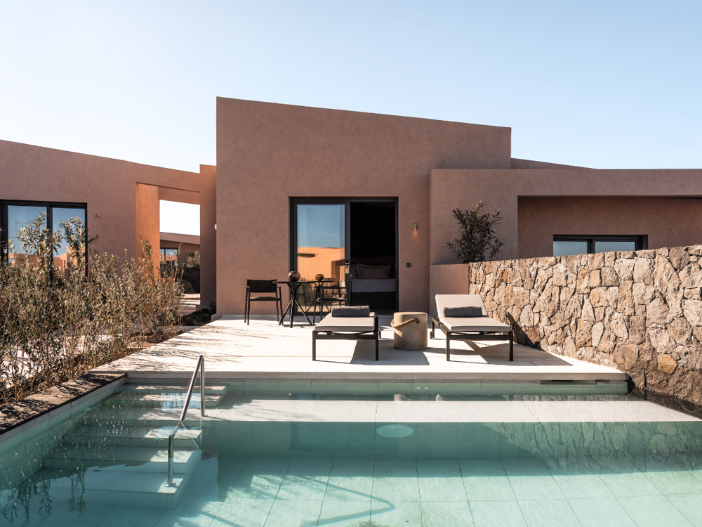 Anesis Bungalow With Zen Pool (40-47m2) accommodates max 2 adults + 2 children | up to 1 baby cot allowed on the top of the max occupancy. King & Sofa Bed & Rollaway Bed, and a terrace with a zen pool and views overlooking the resort. Part of the Haute Living Selection.