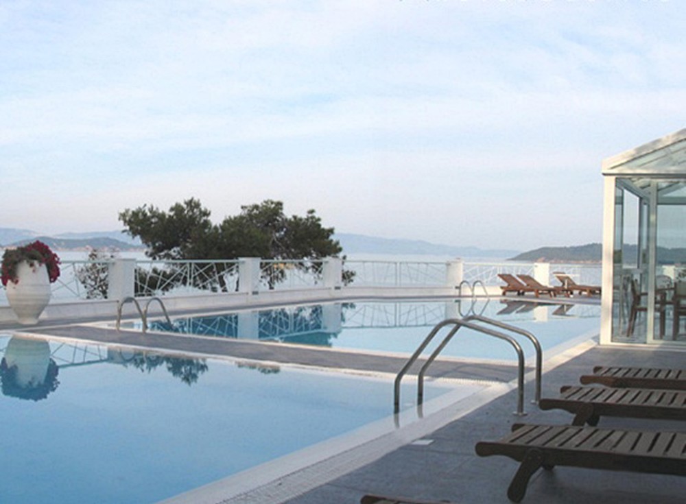 Sapphire waters, emerald pine trees and topaz blue skies surround Hotel Suites Cape Kanapitsa of Skiathos. Placed on a private peninsula of 8-acre property overlooking the Aegean and the magnificent Bay of Kanapitsa, Hotel-Suites Cape Kanapitsa occupies what is undoubtedly one of the best positions on the island. Built high on a headland between two wide bays on the grounds of the pretty Hotel Suites Cape Kanapitsa, they are set in abundance semi-tropical gardens with an attractive seawater swimming pool and bar overlooking the Aegean.