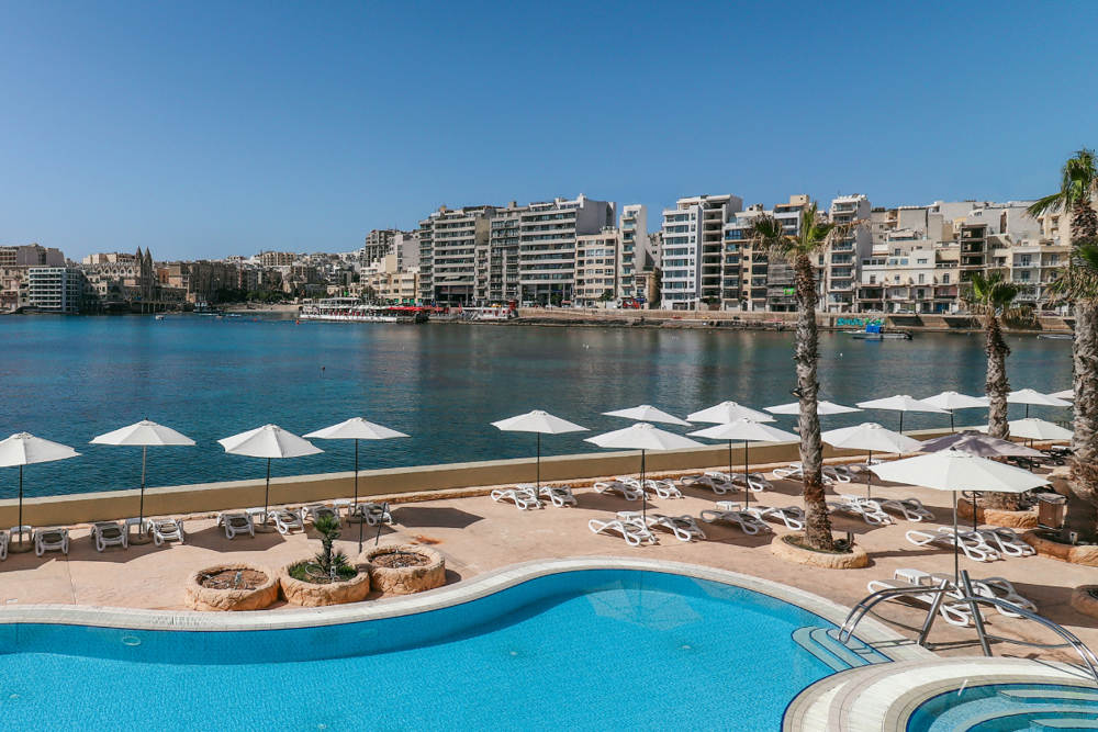 The Hotel has its own private lido with a large outdoor swimming pool as well as a large sun deck with sun beds, parasols, changing rooms, showers and a children's paddling pool. Guests can make use of the indoor swimming pool which is enclosed within a solarium and is heated between (Nov-Apr). A sauna is also available. Other services such as early morning calls and foreign exchange are also available. The lobby area also includes a souvenir shop selling a variety of gifts, popular European newspapers and local road maps, a fitness room which is accessible throughout the day, and meeting areas offering comfortable seating within a relaxed environment. The Lobby is also covered by a complimentary WiFi service allowing guests to access the internet from any seating point within this area. For guests who did not bring their own computers, the hotel also offers an internet corner where free terminals are available. The Lobby also leads out into beautiful terraces overlooking the bay.